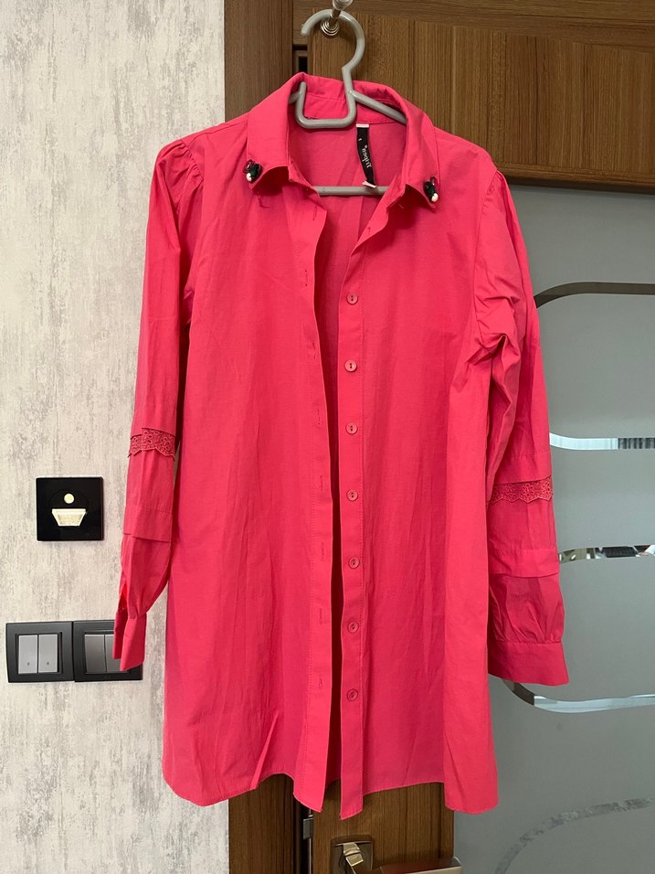 Pembe keten kumaştan, düğmeli, yakalı ve uzun kollu, bol kesim, parlak görünümlü kadın gömleği. Diz üstüne kadar inmekte tesettür giyime uygundur.