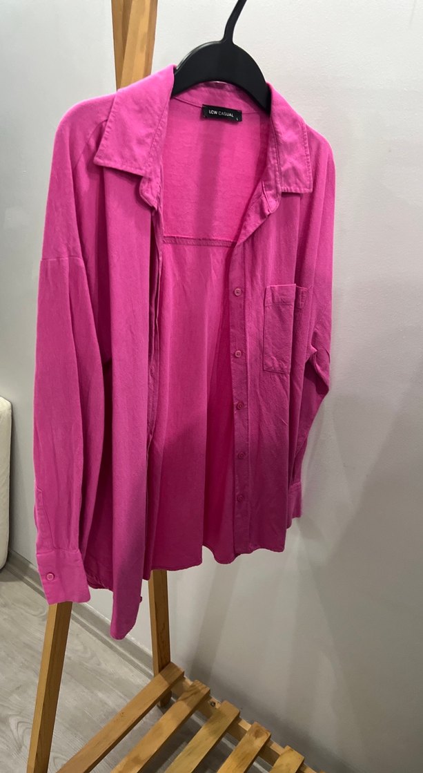 Pembe, keten kumaştan, düğmeli ve cepli, uzun kollu, normal boyda rahat kesim kadın gömleği. Sokak stiline uygun.