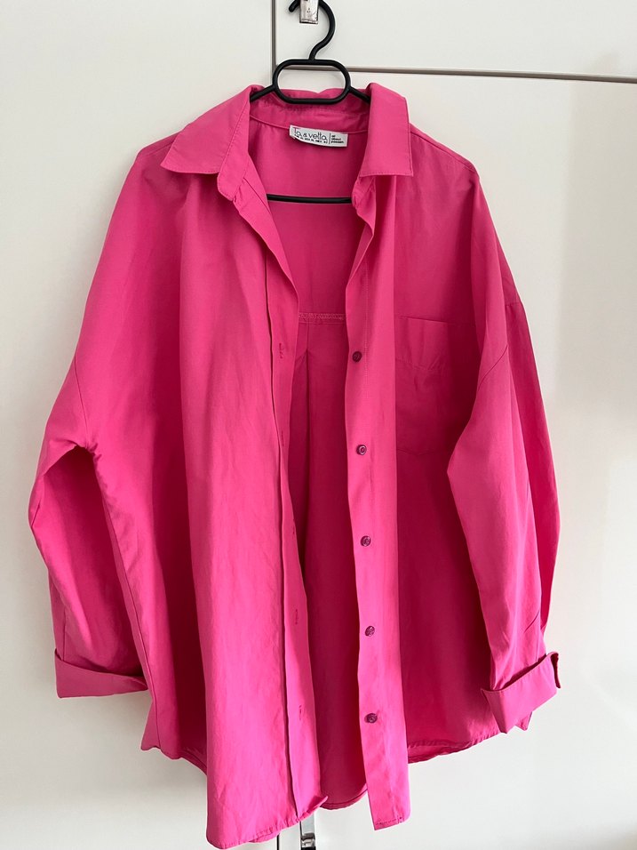 Pembe keten gömlek, düğmeli ve notlu yakalıdır. Uzun kollu, bol kesim ve midi boydadır. Günlük kullanıma uygundur.