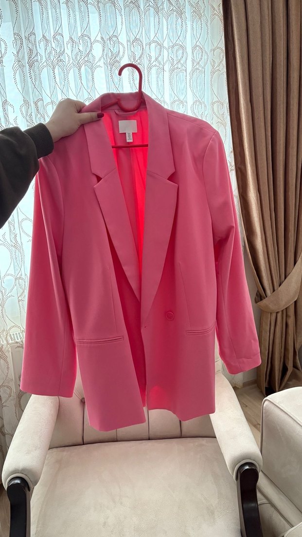 Pembe pastel renkte, düğmeli, uzun kollu, normal kesim kadın blazer ceket. İş ortamı için uygun, notched lapel yakalı ve midi boyda.