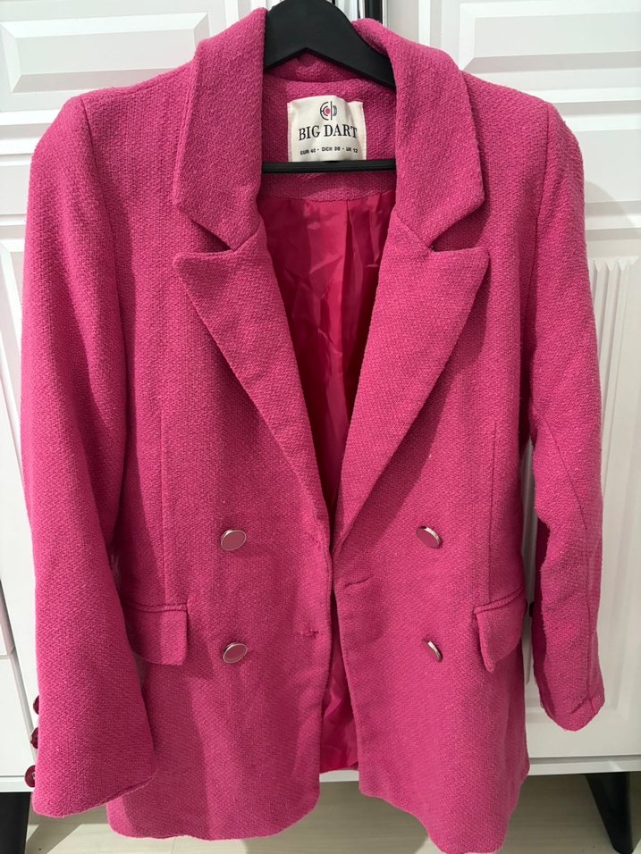 Pembe parlak renkte, düğmeli ve kesik yakalı kadın blazer ceket. Uzun kollu, orta boy ve regular fit olup ofis ve sokak stiline uygundur. Marka: BIGDARY.