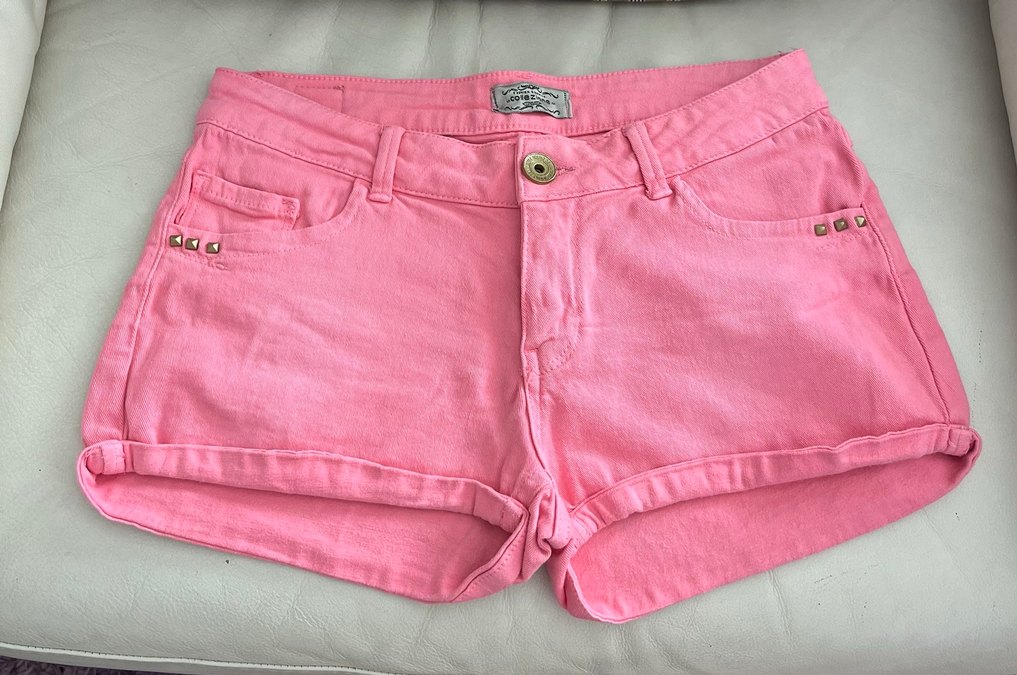 Yumuşak pamuklu kumaştan, düğmeli, pembe renkli, fitted kesim kadın mini şort, gündelik dış mekan kullanımı için uygundur.