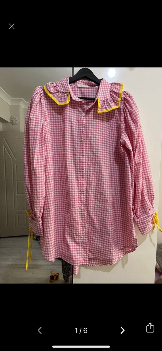 Pembe kareli gömlek, sarı detaylı yakası ve bağcıklı uzun kollarıyla dikkat çeker. Rahat midi boy, sentetik yumuşak kumaştan, gündelik şıklık için uygun. #hoopstore