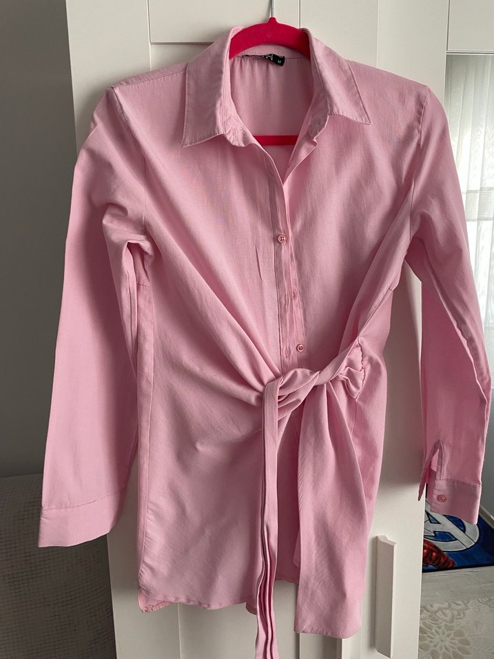 Pembe keten gömlek, uzun kollu, yakalı ve düğmeli. Belde bağlama detayıyla şık ve rahat bir ofis stili sunar. M beden m-L uyumludur