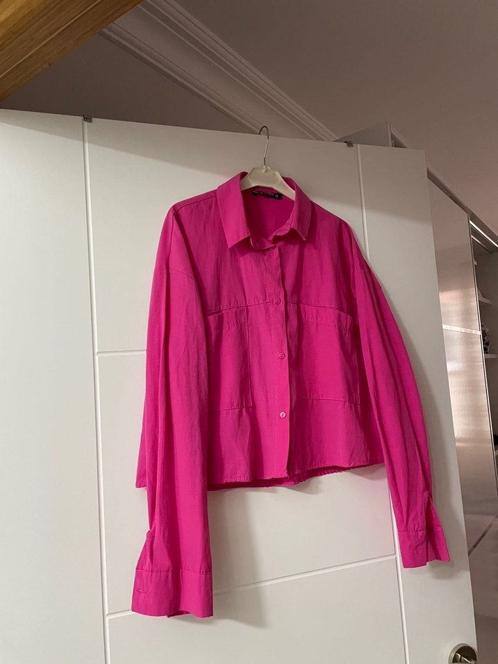 Pembe, parlak keten kumaştan, uzun kollu, düğmeli, kısa kesim ve yakalı kadın gömleği. Rahat ve salaş kesimi günlük kullanıma uygundur.