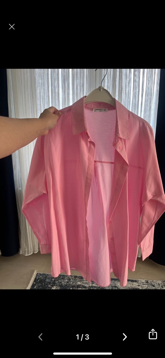 Pembe , uzun kollu, düğmeli ve yakası kesik detaylı bol kesim kadın gömlek. Günlük kullanıma uygun sade tasarım.