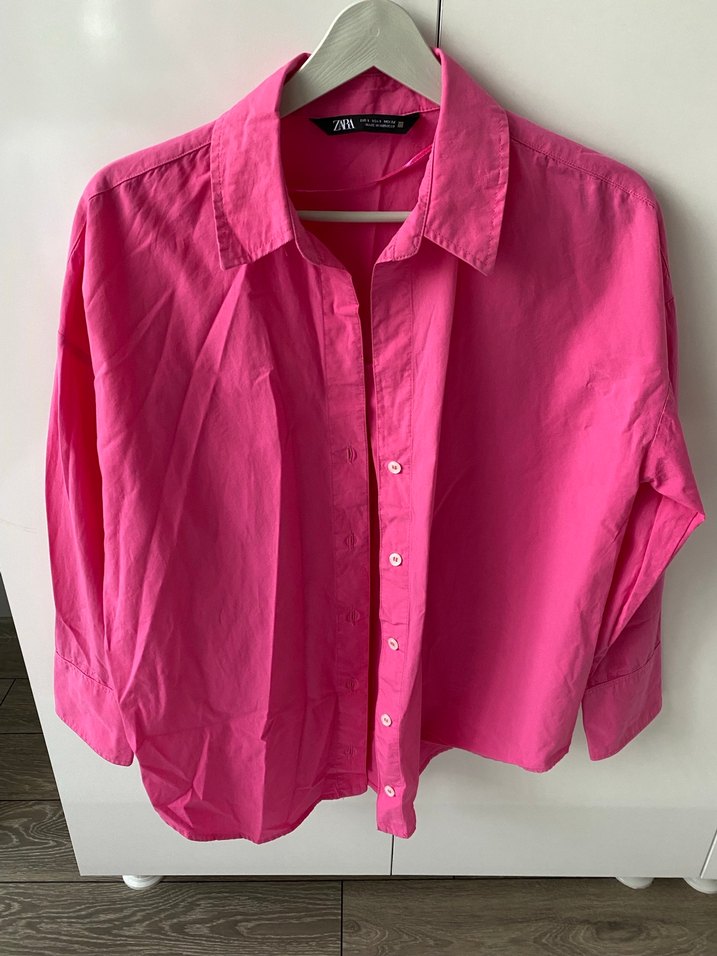 Pembe keten kadın gömlek, düğmeli, yakalı ve uzun kolludur. Rahat kesimi ve midi boyuyla günlük sokak modasına uygundur.