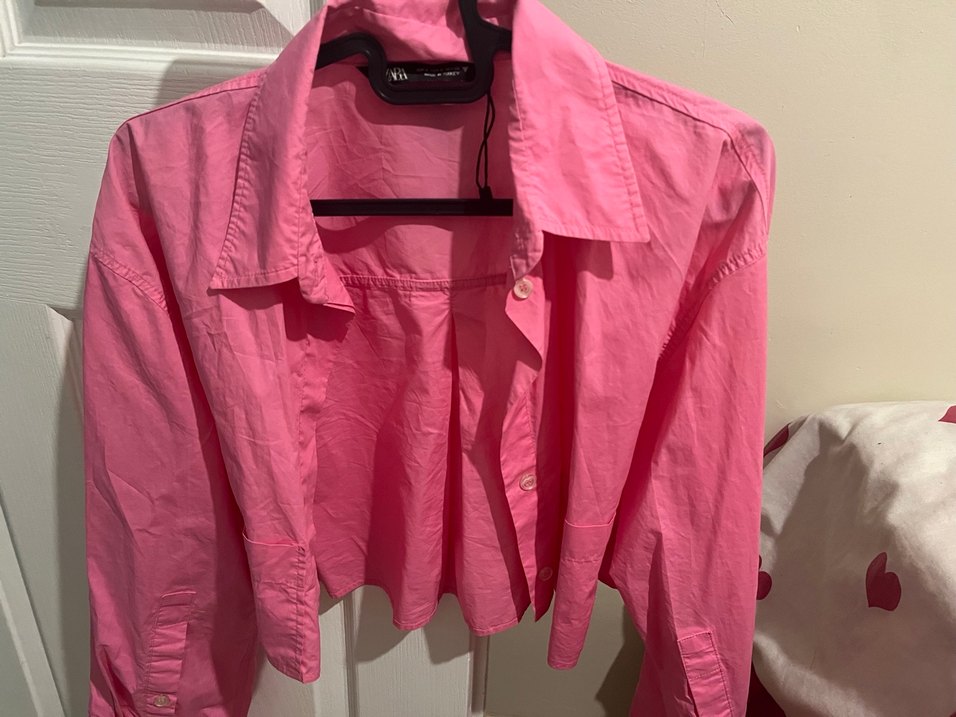 Pembe keten kumaştan, düğmeli, yakalı ve uzun kollu bol kesim gömlek. Pastel tonuyla günlük sokak stiline uygundur.