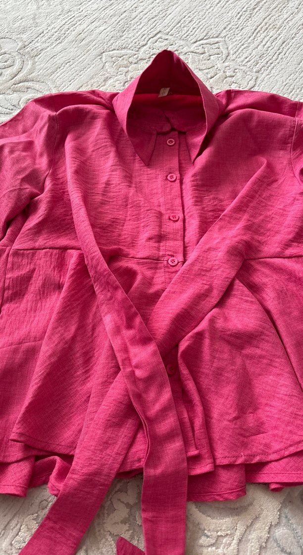 Pembe keten kumaştan, düğmeli ve yakalı, uzun kollu, normal boyda bol kesim kadın gömlek. Günlük kullanıma uygundur.