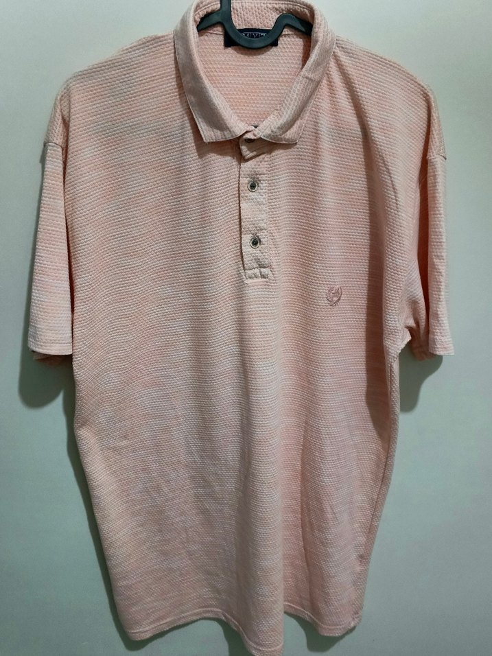 Düğmeli, yaka detaylı kısa kollu pembe erkek polo tişört. Sentetik kumaştan, rahat kesim ve günlük sokak stiline uygun.