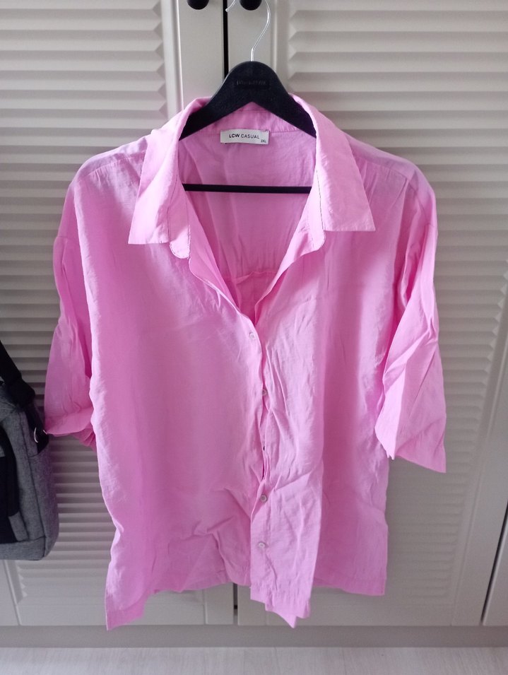 Pastel pembe keten gömlek, kısa kollu, düğmeli, yakalı ve rahat kesimdir. Günlük kullanıma uygun sade ve şık bir modeldir.