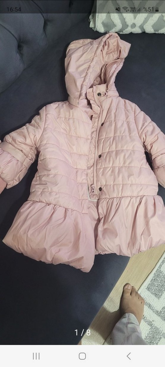 Düğmeli, pastel pembe renkli, sentetik kumaştan kız çocuk montu. Fitted kesim ve notched lapel yakaya sahip, şık ve rahat sokak stili.