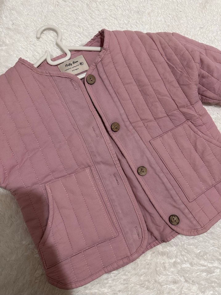 Pastel pembe renkte, pamuk kumaştan yapılmış kız çocuk ceketidir. Düğmeli, notched lapel yakalı ve cep detaylıdır. Rahat kesimli ve desensizdir.