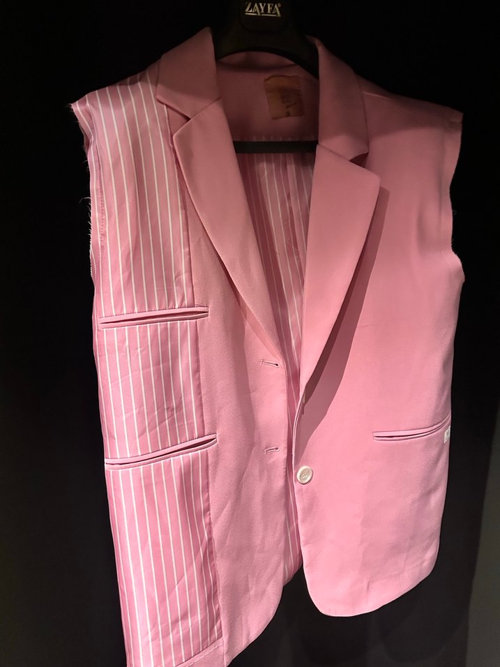Düğmeli, kolsuz pembe blazer. Normal boyda, regular kesim, bir tarafı düz pastel diğer tarafı çizgili detaylı. Ofis için uygun.