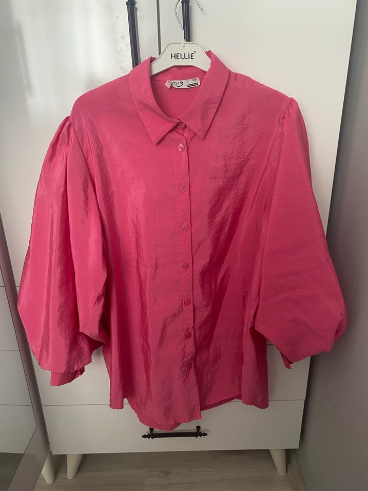 Pembe keten gömlek, düğmeli ön, yakalı ve kısa kolludur. Parlak kumaşı, rahat loose fit kesimiyle ofis için uygundur. Desensiz ve midi boydadır.