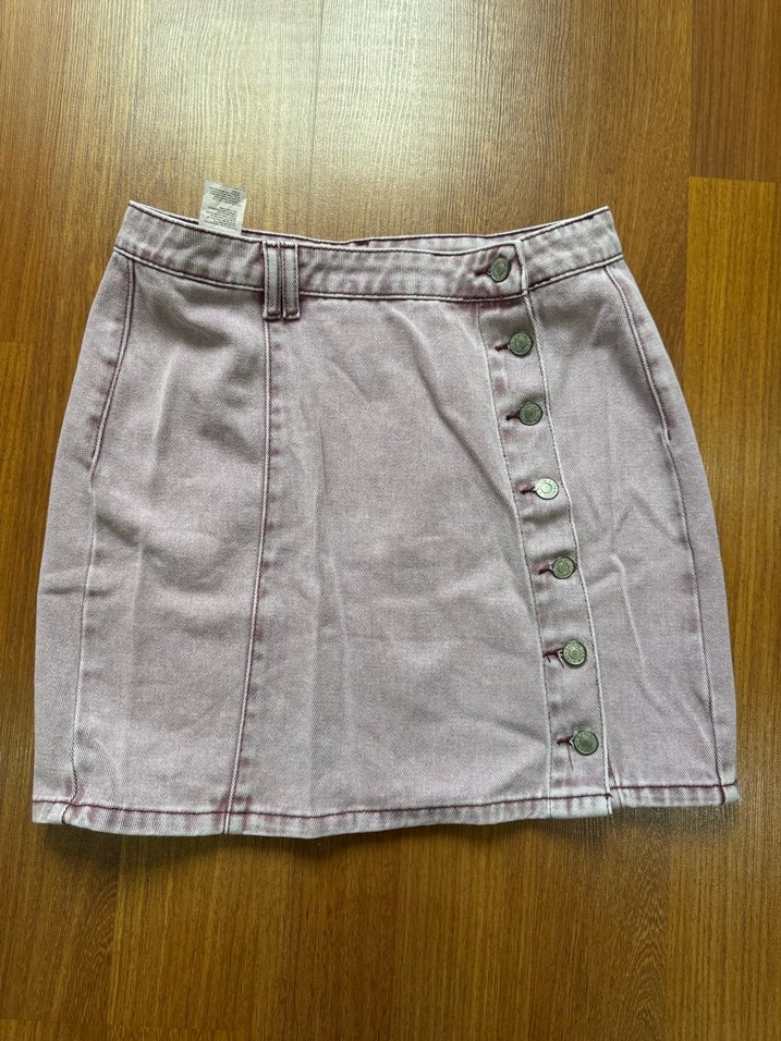 Pembe renkte, düğmeli detaylara sahip bol kesim midi uzunluğunda denim etek. Sade ve desensiz tasarımıyla günlük sokak stiline uygundur. 36-38 bedene uygundur.