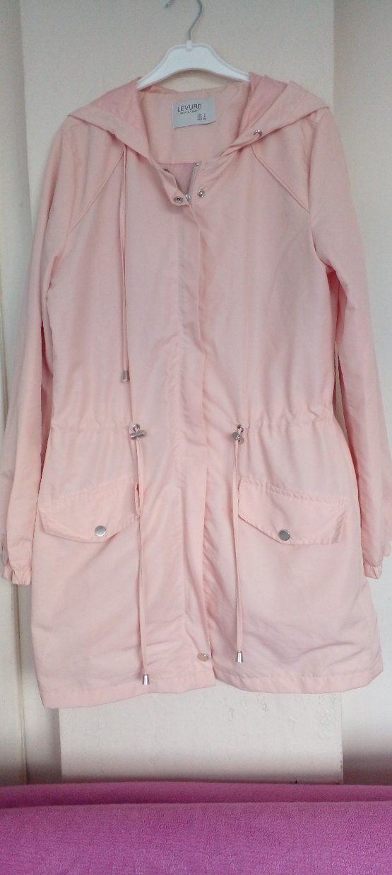 Pembe düğmeli, notched lapel yakalı ve askılı kollu hamile ceketi. Sentetik kumaştan, midi boyda, cep detaylı, rahat kesim sokak stili ceket.