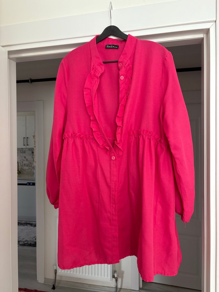 Pembe, uzun kollu keten hamile ceketi, düğmeli ve yakalıdır. Midi boyda, bol kesim ve önünde hafif fırfır detayı bulunur. Günlük kullanıma uygun bohem tarz.