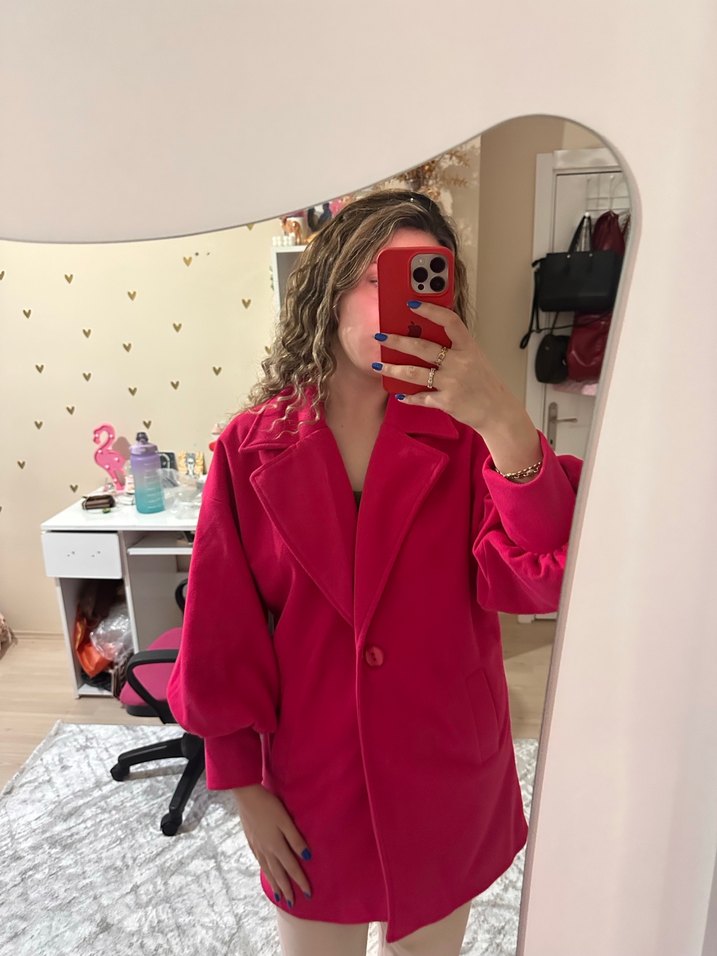 Parlak pembe renkte, düğmeli ve kesik yakalı kadın kabanı. Uzun kollu ve bol kesimli, rahat günlük kullanım için midi boyda.az kullanıldı sorunsuz çok tatlı bi parça