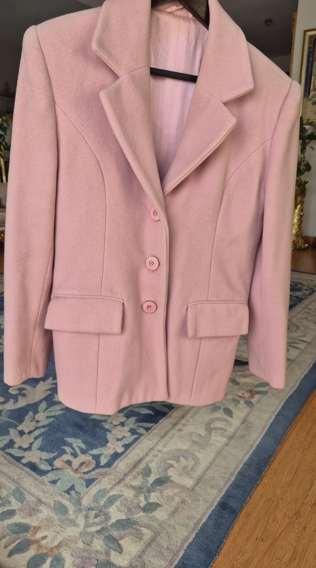 Düğmeli, pembe pastel renkte, yumuşak ve sıcak kumaştan yapılmış kadın midi ceket. Normal kesim, uzun kollu ve modern klasik tarzda, ofis kullanımı için uygundur.
