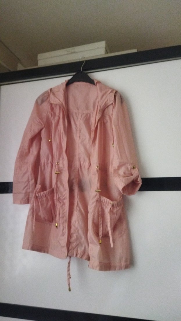 Pembe renginde, düğmeli ve notched lapel yakalı midi yağmurluk. Parlak sentetik kumaştan, bol kesim ve askılı kollu, günlük kullanıma uygun.