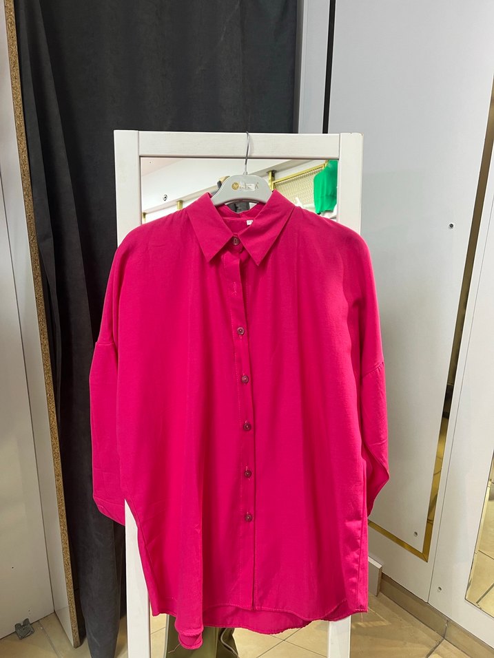 Bedenler mevcut Pembe keten gömlek, düğmeli önde, kısa kollu ve yakalıdır. Rahat kesimi ve midi boyuyla günlük kullanıma uygundur.