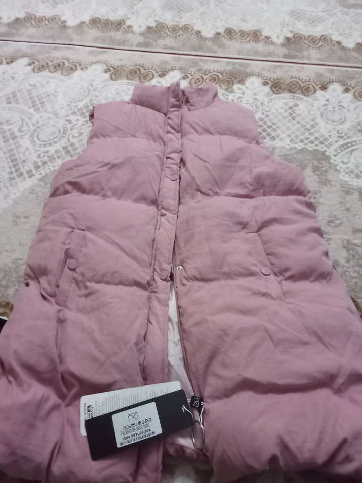 Yumuşak sentetik kumaştan, düğmeli ön kısmı ve normal boyu ile pembe kolsuz kadın yelek, rahat sokak stili için uygundur. modelleri için kaydiriniz