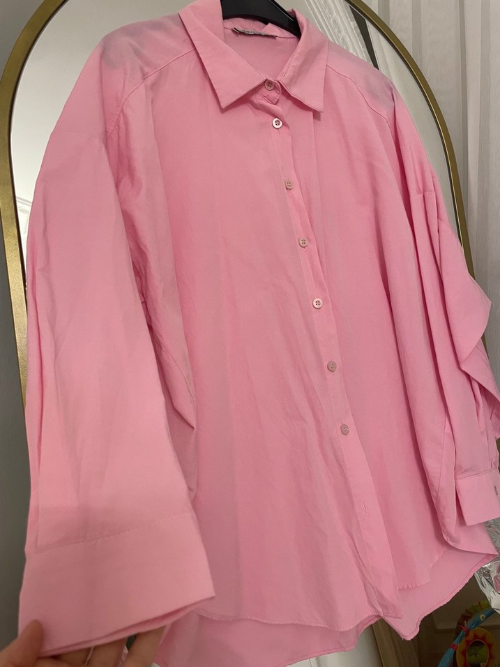 Pastel pembe renkte, düğmeli ve yakalı uzun kollu gömlek. Yumuşak kumaştan, rahat kesim