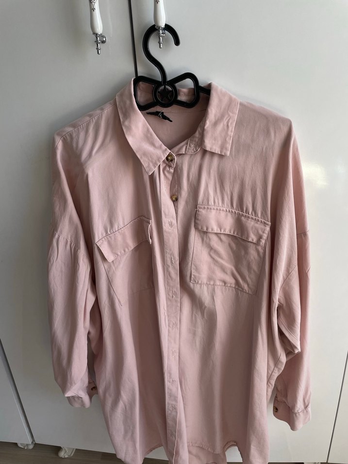 Pembe,düğmeli ve yakalı, uzun kollu salaş kesim gömlek. Normal midi boyda, rahat ve şık bir günlük stil için uygun.
