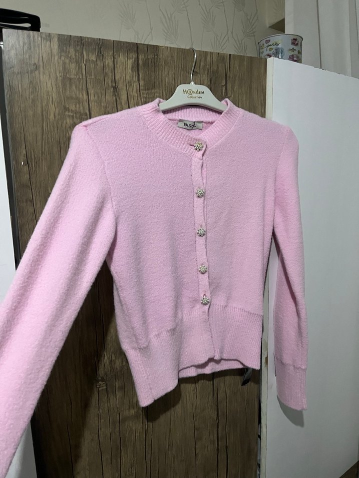Bu pembe triko hırka, uzun kollu, yuvarlak yaka ve düğmeli olup günlük rahat kullanıma uygundur.