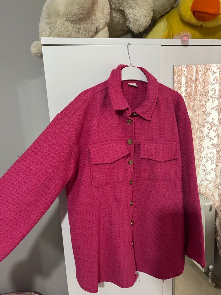 Pembe parlak renkte, düğmeli ve kesik yaka detaylı Uzun kollu, bol kesim Midi boyda, günlük rahat kullanıma uygun.
