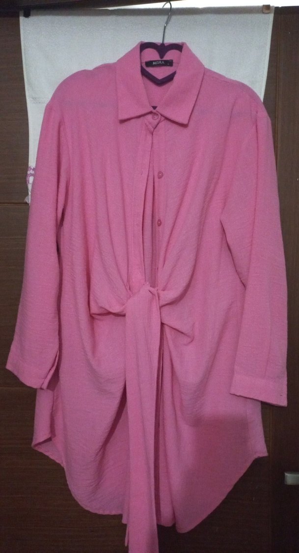 Pembe gömlek, yakalı, düğmeli ve uzun kolludur. Salaş kesim, midi boy ve önünde bağlama detayı vardır, ofis için uygundur.