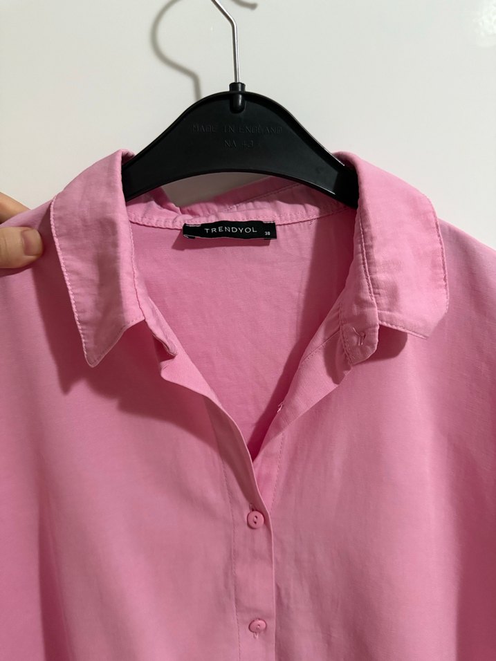 Pembe pamuklu kumaştan, düğmeli ve yakalı uzun kollu bol kesim gömlek. Pastel tonu ve sade tasarımıyla günlük kullanıma uygundur.