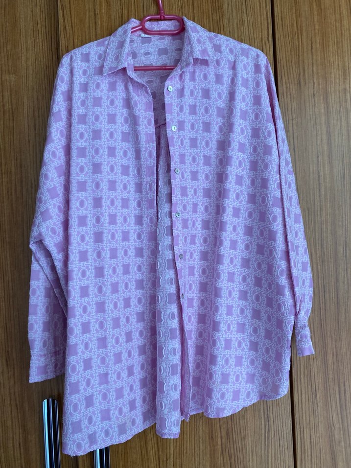 Pembe pastel renkte, düğmeli ve uzun kollu, gevşek kesim kadın gömleği. Yumuşak tekstil kumaştan, günlük kullanıma uygun rahat bir model.