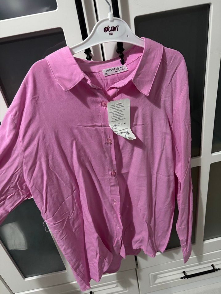 Pembe renkli, keten kumaştan yapılmış, düğmeli ve uzun kollu, yakalı bol kesim kadın gömleği. Rahat ve günlük kullanıma uygun.
