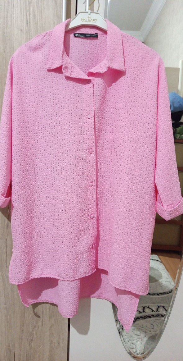 Pembe keten gömlek, uzun kollu, V yaka ve düğmeli tasarıma sahiptir. Gevşek kesimi ve midi uzunluğu ile rahat bir kullanım sunar.