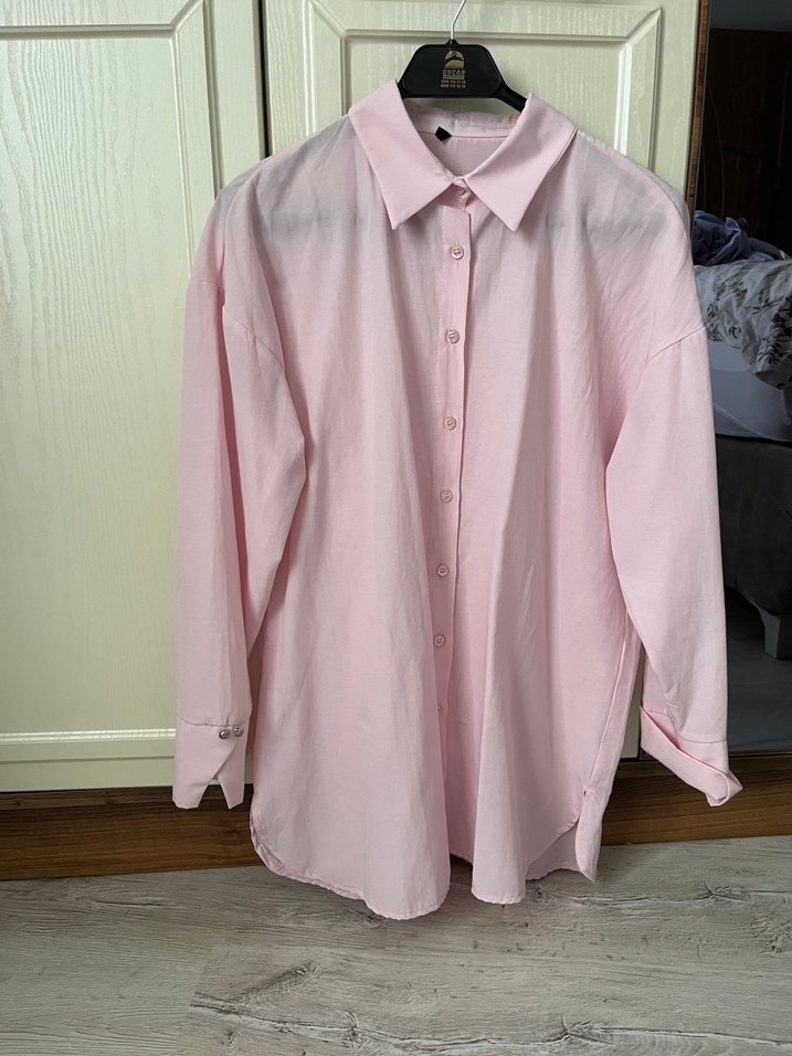 Pembe pastel keten gömlek, uzun kollu ve düğmeli. Salaş kesim, normal midi uzunlukta, günlük kullanıma uygun.