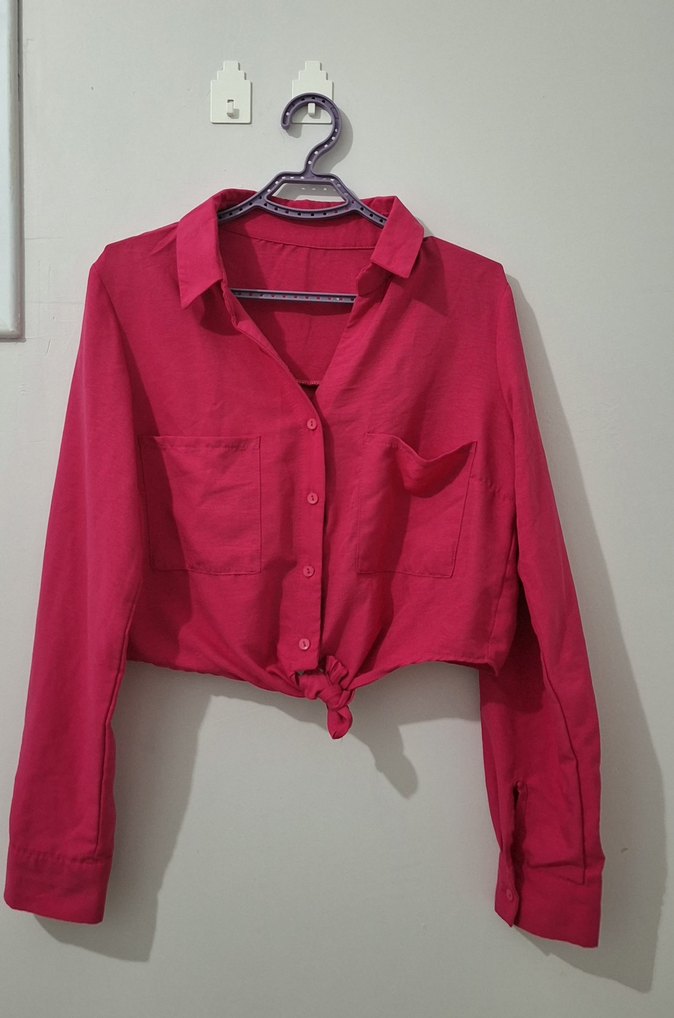 Crop kesim önünde ip detaylı bir gömlek.Şeker pembesi renginde Pembe renkli, uzun kollu ve düğmeli ön kısmı olan, yakalı, kısa uzunlukta bol kesim gömlek. Önde düğüm detayıyla trend sokak stili için uygun.