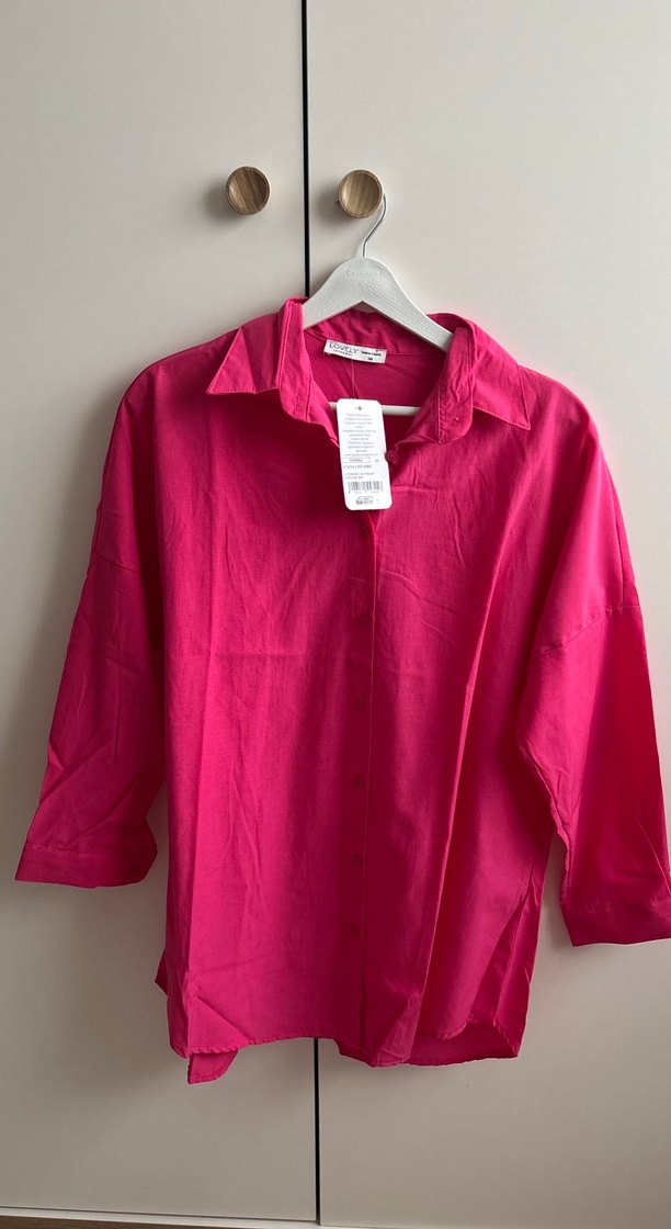 Marka temsilidir hiç giyilmedi Pembe keten kumaştan, uzun kollu ve düğmeli, yakalı, bol kesim günlük sokak stili gömlek.