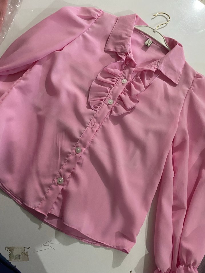 Pembe renkli, düğmeli ve fırfırlı ön detaylı uzun kollu kadın gömleği. Rahat kesimli ve yumuşak sentetik kumaştan üretilmiştir.