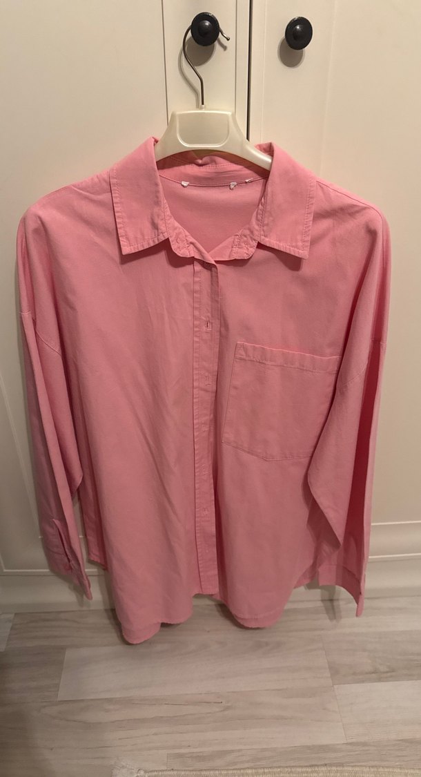 Bol kesim, pastel pembe pamuk gömlek, düğmeli ve yakalıdır. Uzun kollu ve göğüs cebine sahiptir, günlük rahat kullanım için uygundur.