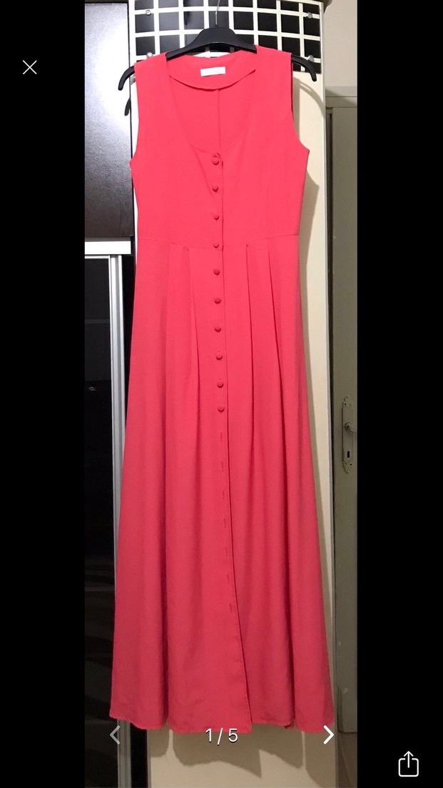 Pembe renkte, düğmeli ve V yakalı, kolsuz uzun elbise. Rahat oturan, yumuşak sentetik kumaştan yapılmıştır.