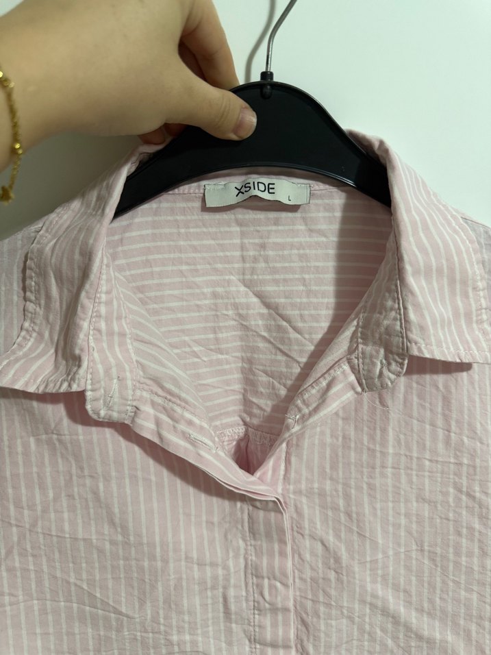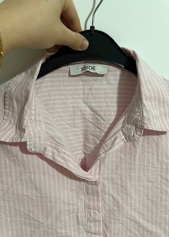 Pembe renkli, çizgili düğmeli V yaka ve uzun kollu gömlek. Rahat kesim, normal boy ve hafif baskılı desene sahip pamuklu yumuşak kumaştan üretilmiştir.