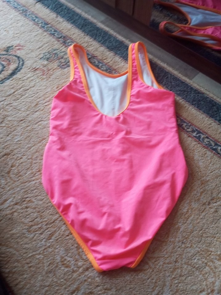 Kolsuz, pembe ve turuncu detaylı düz kadın mayo. Midi boy ve vücuda oturan kesimiyle plaj ve sokak stiline uygun. 9-10 yas