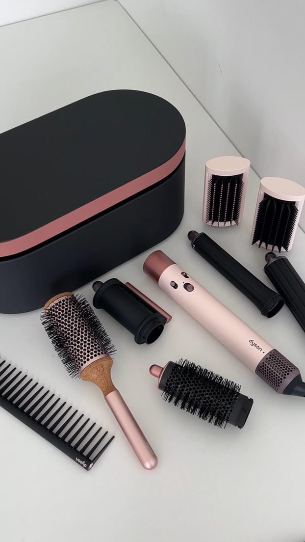 Pembe Dyson saç şekillendirici seti, çoklu fırça başlıkları, tarak ve şık saklama kutusuyla çeşitli şekillendirme imkanı sunar. ♀️