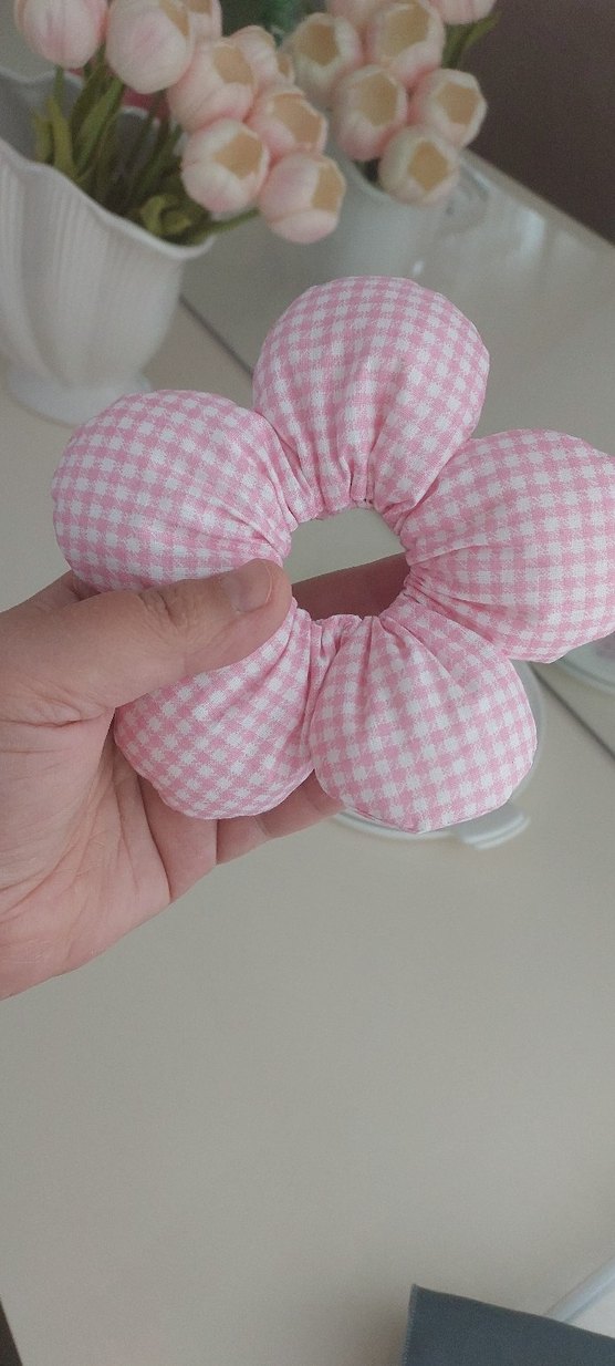 Pastel pembe ekose desenli, çiçek şeklinde yumuşak elyaf dolgulu pinterest cicek toka