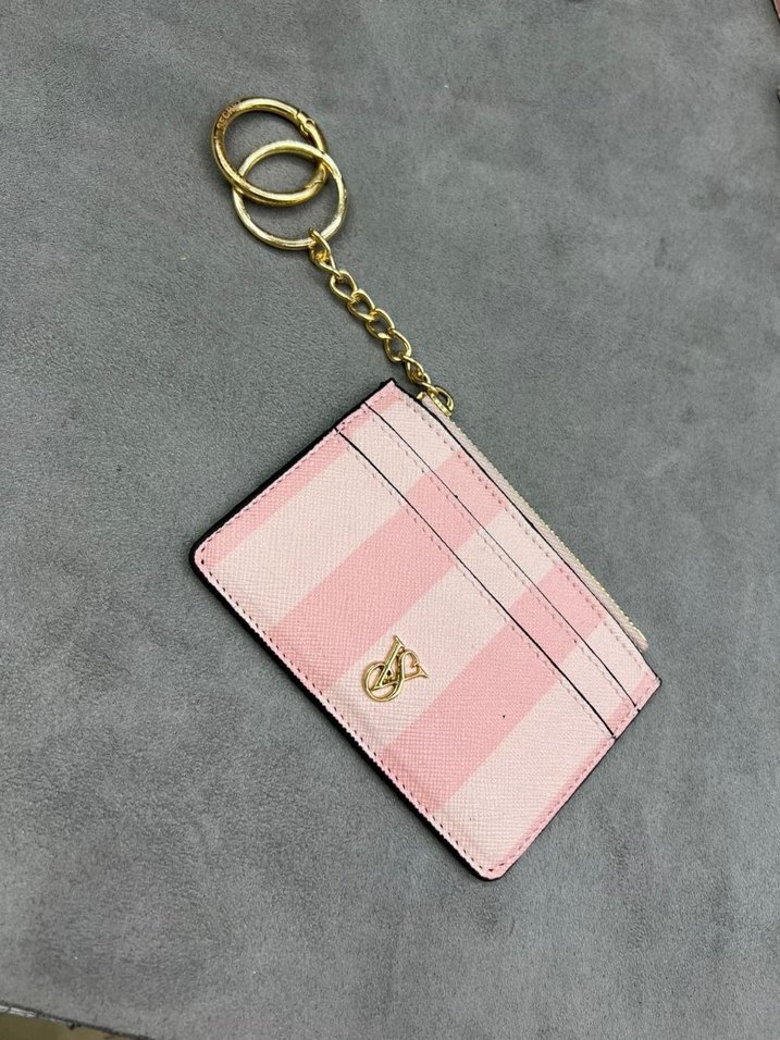 Pembe ekose desenli, fermuarlı ve anahtarlıklı deri kadın cüzdanı, Paris sokak modasına uygun şık tasarım.