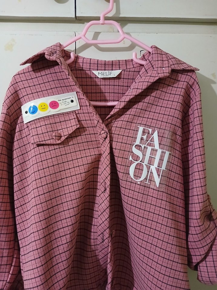 Pembe ekose desenli, uzun kollu, düğmeli ve rahat kesim kadın gömlek. Notlu yaka ve baskılı detaylarla sokak stiline uygun.