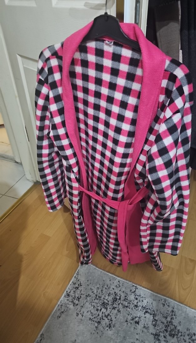 S/M Renkli pembe ekose desenli, bele oturan kadın bornoz. Normal midi boyda, rahat, askılı kollu ve kuşaklı.