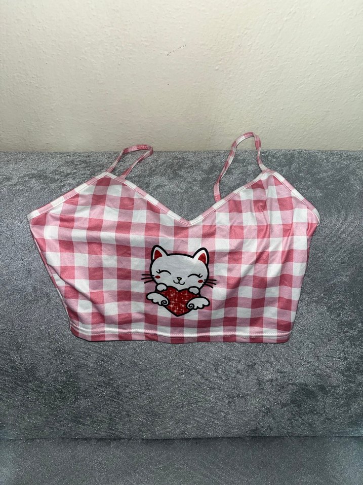 Pastel pembe renkte, ekose desenli, örme kumaştan yapılmış, kalp tutan kedi baskılı sokak stili üst.